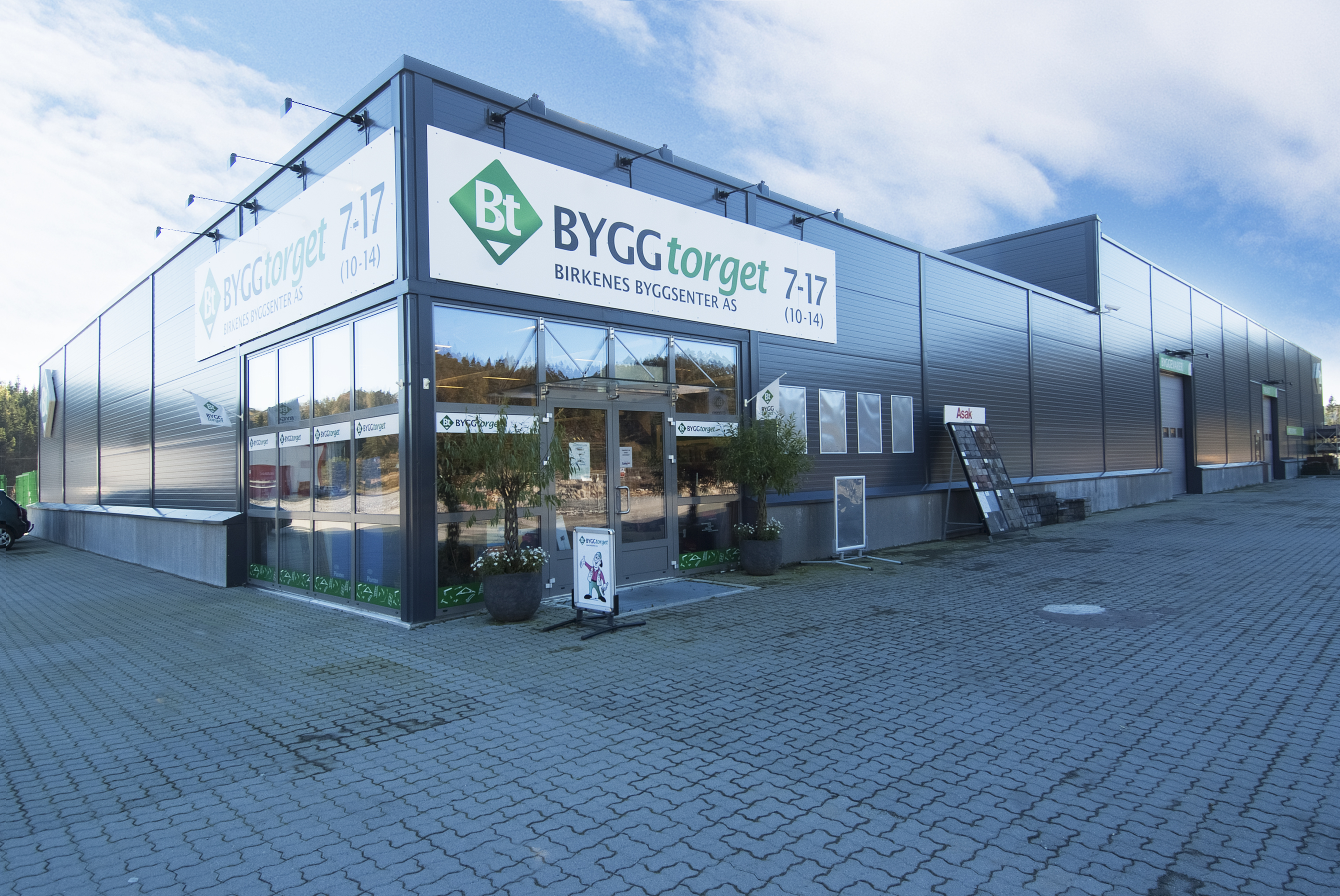 Ny butikk med kontorer og lager for Byggtorget på Birkeland. Utført som hovedentreprise med komplett råbygg inkl betongarbeider.